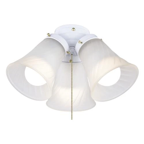 This three-light fan light features a white color and frosted swirl glass, making it an ideal choice for replacing worn or outdated fan light fixtures. The simplistic style goes well with a variety of common ceiling fans and three LED bulbs are included for easy installation.