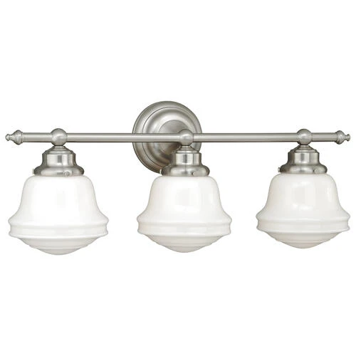The Huntley is a timeless collection inspired by mid-century small-town aesthetics. The vintage school house glass is the focal point of this design with its unique profile and glass options. Offered in multiple finishes and glass options, this versatile farmhouse light will provide a unique accent to a variety of kitchen, dining, and bathroom settings. Medium screw base lamping provides maximum light output. The complete collection includes chandeliers, pendants, semi-flush ceiling lights, and 1, 2 3, and 4 light bathroom vanities.