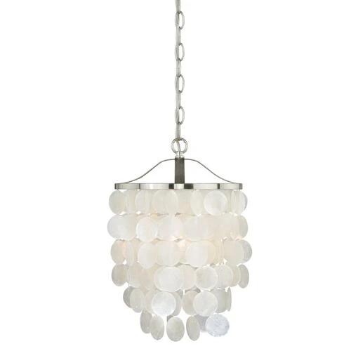 Soft contemporary styling combined with texture and iridescence. The Elsa collection pendant is a unique option for use above an eating area, or (in multiples above) an elongated island, or to accent a small room or foyer space. Tiers of hand-strung natural Capiz shells create a soft diffused light that perfectly compliments the satin nickel metal elements. This is a full collection with coordinating pieces to decorate any room in the house. Features medium screw base lamping; frosted bulb recommended for best appearance.