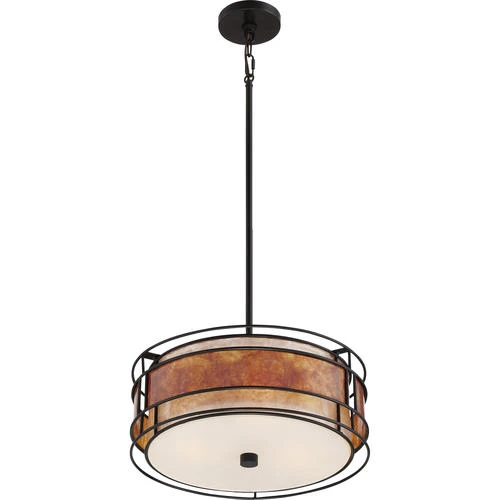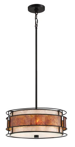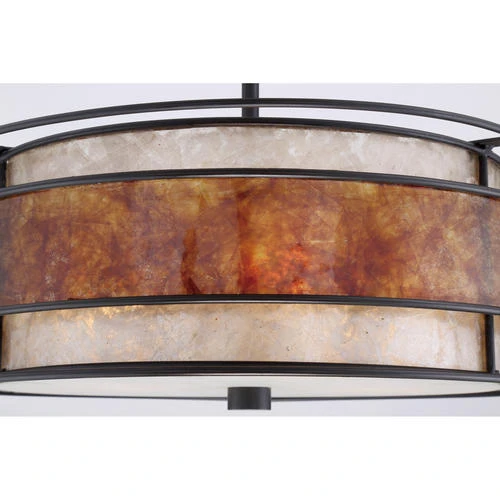 - Features a hand-welded metal shade with two toned natural mica and a bronze finish