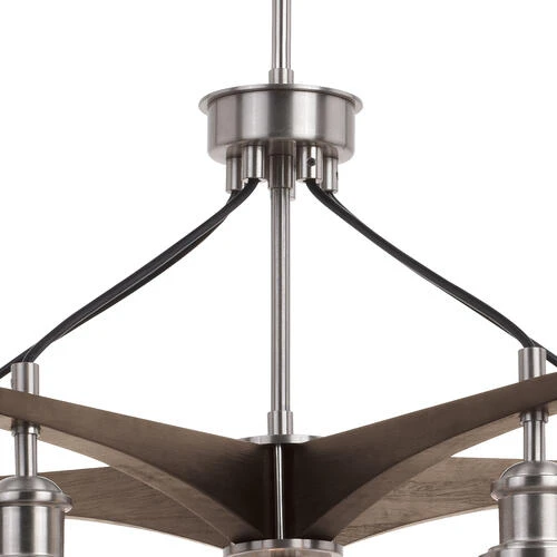 We revisited the on-trend style of modern farmhouse lighting with the Avondale collection. The mix of warm natural wood and cool light materials combine to create a delicate balance between farmhouse, modern and transitional decor. This hanging ceiling light has sculpted arms of rustic wood that radiate out from a slim central column of satin nickel. Clear seeded glass globes dangle from each arm creating a captivating combination evoking a feeling of warmth and comfort. This chandelier will complement a variety of spaces including dining rooms, kitchen islands, bedrooms, foyers, entryways, living rooms, and more. Coordinate the look with the matching wall light fixture.