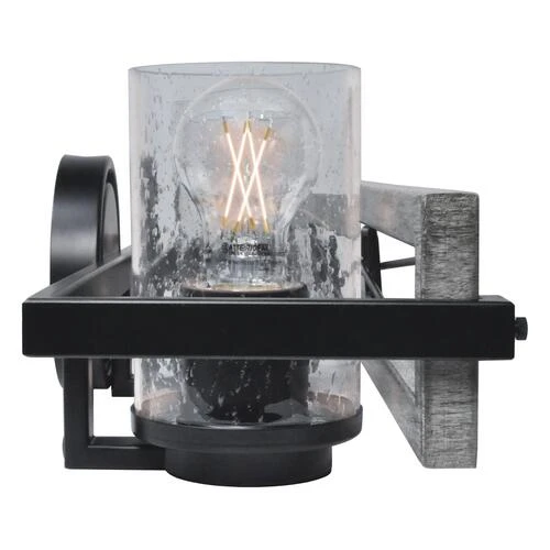 The Patriot Lighting® Lizzie three-light vanity light will bring pleasant and warm light to your bathroom. At 24 inches long, this light will give plenty of light across your vanity. Matte black wire is paired perfectly with a distressed gray faux wood finish and clear seeded glass, giving it a stylish look. Enhance the look with vintage Edison-type bulbs (sold separately).
