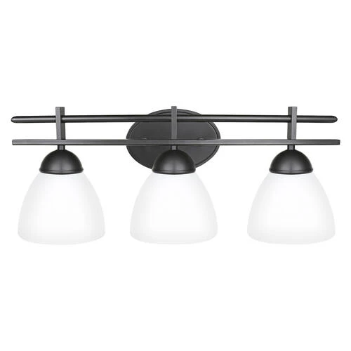 The Patriot Lighting« Meila three-light LED vanity light combines fashion with the ability to fit many different styles of d?cor. This bathroom fixture features a bronze finish with the added benefits of LED technology. These lights only use 24-1/2 watts of energy and last up to 50,000 hours of use without replacing any bulbs.