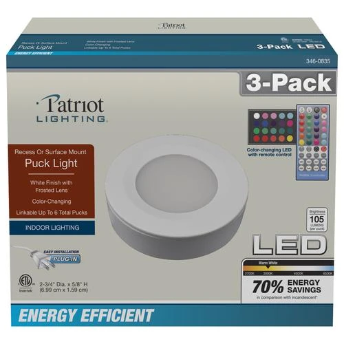 This Patriot Lighting® three-pack RGBWW LED white puck light has one plug-in driver for easy installation. It can be recessed or surface mounted. Easily link up to six puck lights. The three-pack RGBW LED puck light includes one remote control for controlling light on/off, dimming, 20 static color options, and six light-setting modes.