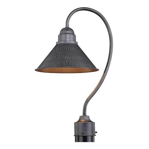 The Patriot Lighting® Outland collection is a solid choice for your outdoor space. The textured, aged-iron finish gives this barn light a warm and inviting elegance, and the gold finish inside the shade adds to the charm. This fixture is dark sky compliant and will complement any industrial, cottage, modern country, or farmhouse style home. This gooseneck post light mounts on a three-inch diameter post (not included). It is ideal for illuminating your yard, driveway, or any other area of your home.
