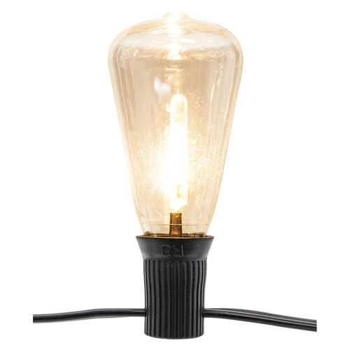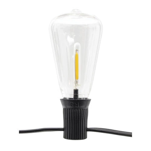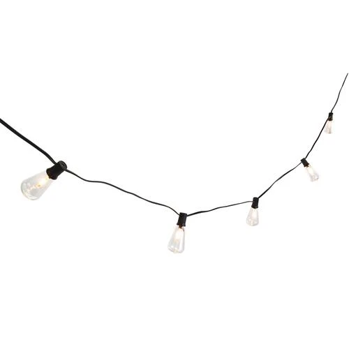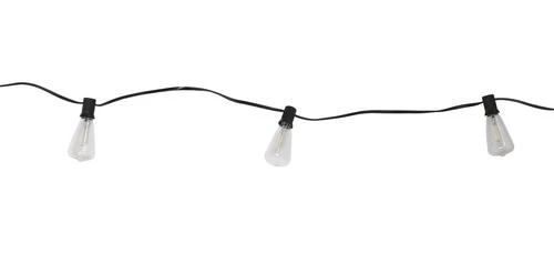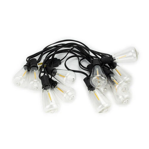 Use this Patriot Lighting® String Light with Clear Vintage Bulbs to decorate your outdoor patios, porches, or party events. The light set has a black wire with a overall length of twelve feet, and a total of 12 bulbs, with 12 inch spacing between bulbs. You can connect up to 50 sets end to end with no additional tools or wiring required.
