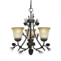 The Pines 3 light Mini Chandelier combines rustic and classic styling that brings nature indoors. Great for lodges, cabins, and nature-styled interiors, this fixture features black walnut finish and creme cognac glass, with pine tree elements. This is a great piece to add a special feel to any dining, living or bedroom areas.