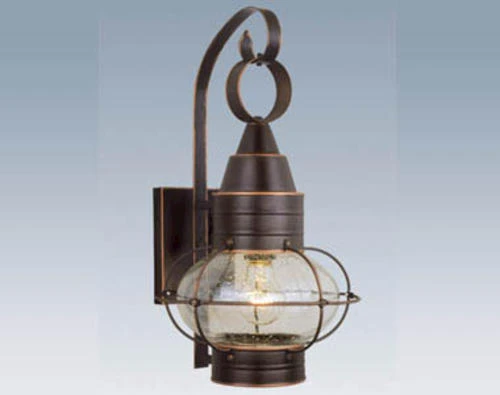 This trendy onion style Patriot Lighting® outdoor wall light adds a special look you need in your outdoors. The burnished bronze finish and seeded glass come together well to compliment the rounded shape and distinct design. Add flare and a charming look to your outdoor spaces.