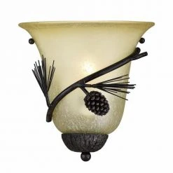 The Pines wall sconce combines rustic and classic styling that brings nature indoors. Great for lodges, cabins, and nature-styled interiors, this fixture features black walnut finish and creme cognac glass, with pine tree elements. This is a great piece to add a special feel to any room.