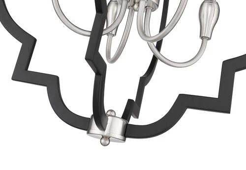 - Features a black iron frame and brushed nickel round mounting plate, hanging chain, and candelabra-style lighting