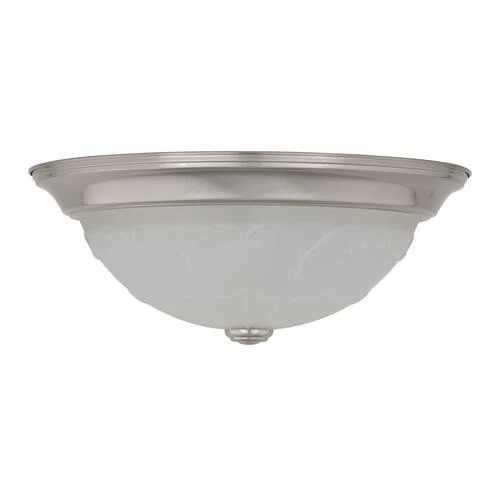 Patriot Lighting 13 inch Paula twin pack flush mount offers a sleek, practical look. The fixture features satin nickel finish and frosted glass with floral pattern that casts soft light. This indoor fixture is ideal for entryways, kitchens, bedrooms, and other interior areas.