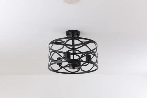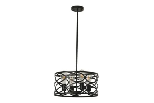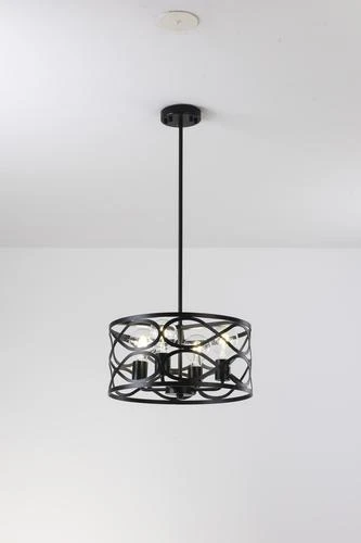 The transitional style of the Phinny matte black four-light semi-flush light with caged detail is both practical and stylish. The simple style and modern lines make this lighting feature ideal for above your kitchen island. It may be installed as a semi-flush ceiling light, or install with included down rods to make it a stylish pendant light.