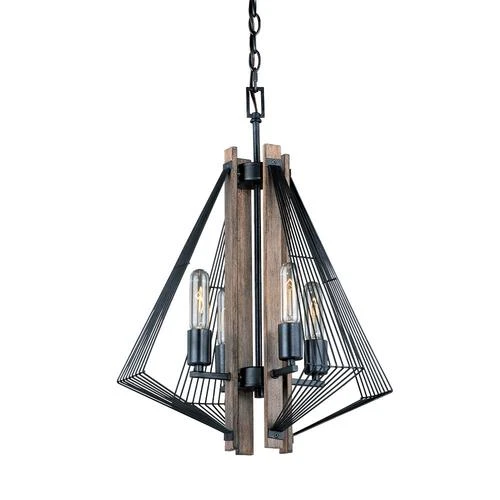 Strong geometric overtones clearly suggest a modern industrial flair in the Rochester 4 light chandelier. Black Iron finished wire along with accents of burnished oak are a stunning combination.