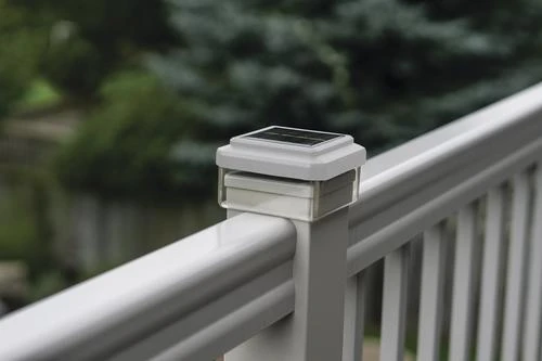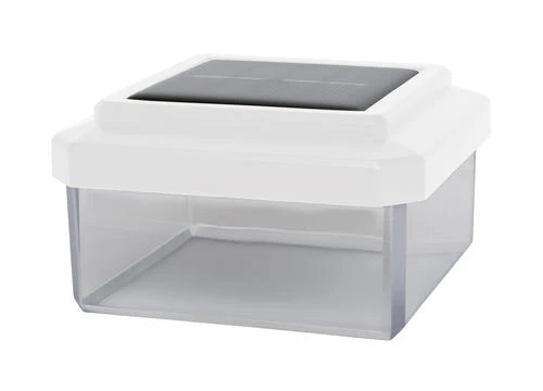 The Patriot Lighting® Harlan Solar LED Four Pack 2-1/2″ Rail Cap Light Set features an attractive profile on all four sides, creating a unique look that will enhance any deck railing or post. Each light is made of durable plastic construction with a white finish and clear lens, each with eight warm white SMD LEDs (eight lumens light output). It will fit 2-1/2″ x 2-1/2″ rail posts and is very easy to install as no mounting hardware is required. It automatically turns on at dusk for up to eight hours of illumination. This product is also available in black.