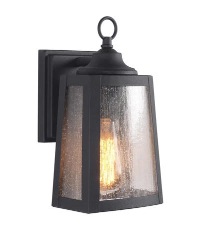 - Traditional outdoor wall lantern with black powder coated steel and clear seeded glass panels